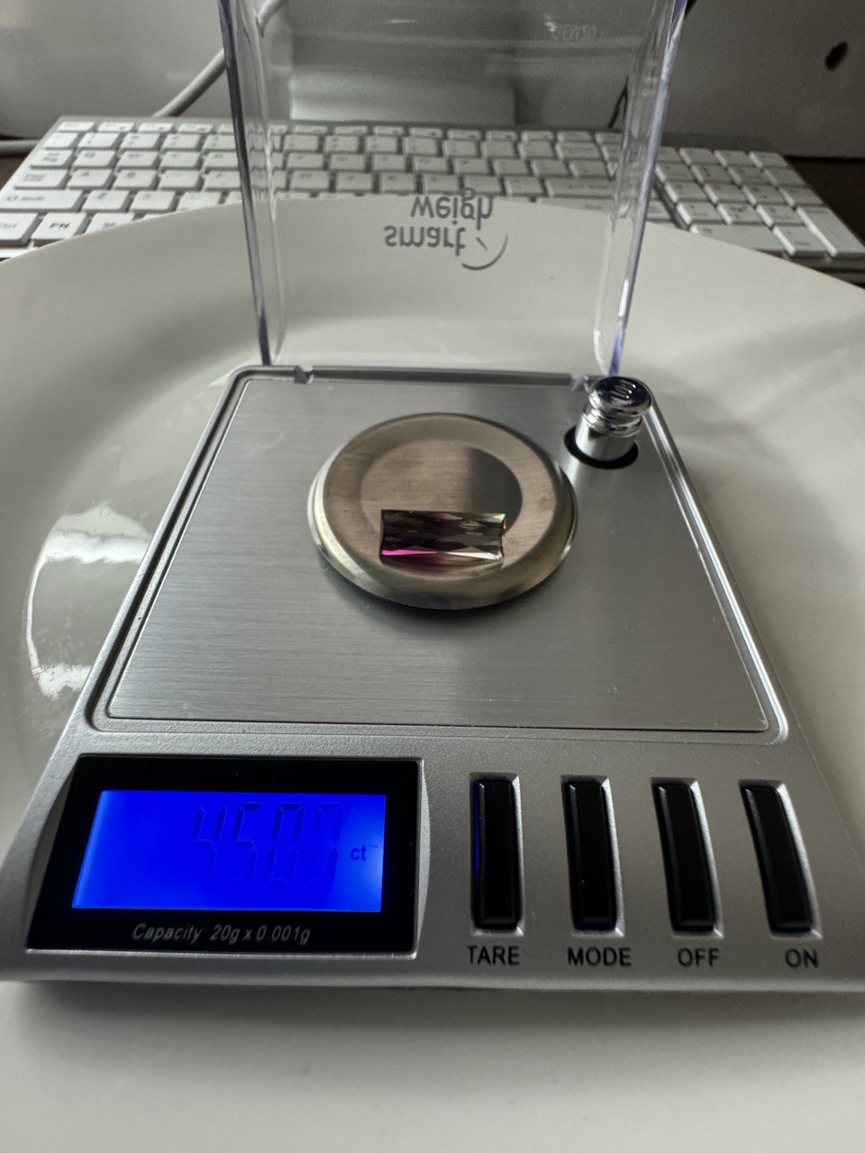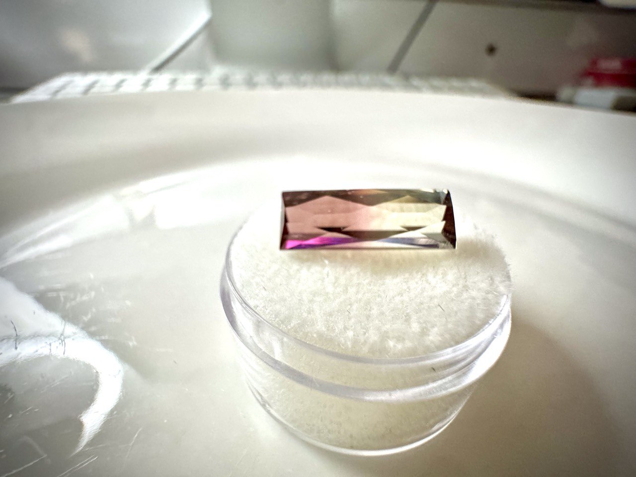 This 4.5 carat natural Pale Green to Pink Tourmaline was found in Democratic Republic of Congo. Purchased directly from local dealers and cut in Tanzania by Maria. Tourmaline has a hardness of 7-7.5 on the Mohs hardness scale.